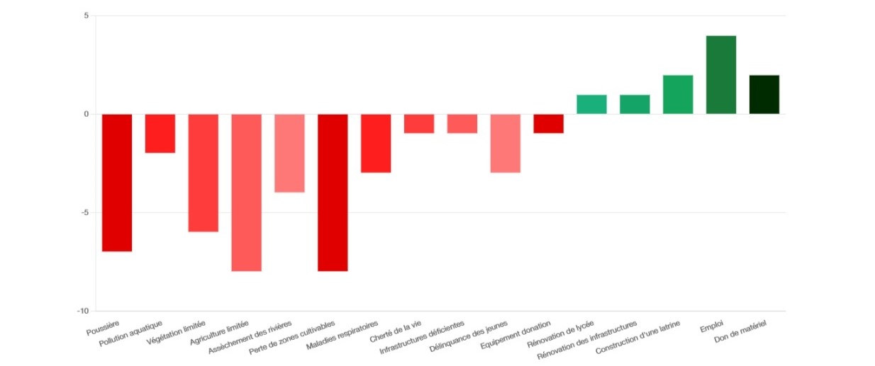 Les associations de Boffa ont fait état d’impacts positifs dans le domaine de l’emploi et des infrastructures. En comparaison, celles de Boké ont plutôt mis l’accent sur l’impact négatif de l’activité minière tels que résumés dans le graphique ci-après.