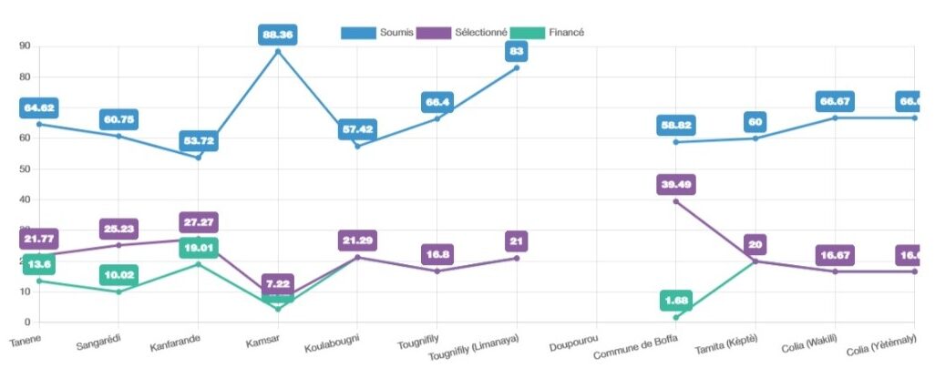 Le graphique affiche la différence entre le nombre de projets reçus, sélectionnés et financés au final. L’objectif de ce graphique serait d’une part d’analyser le nombre de demandes reçues par rapport aux potentialités des communautés et d’autre part d’expliquer l’écart quant aux projets jugés durables qui ont pu bénéficié des fonds FODEL.